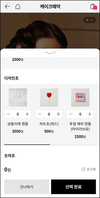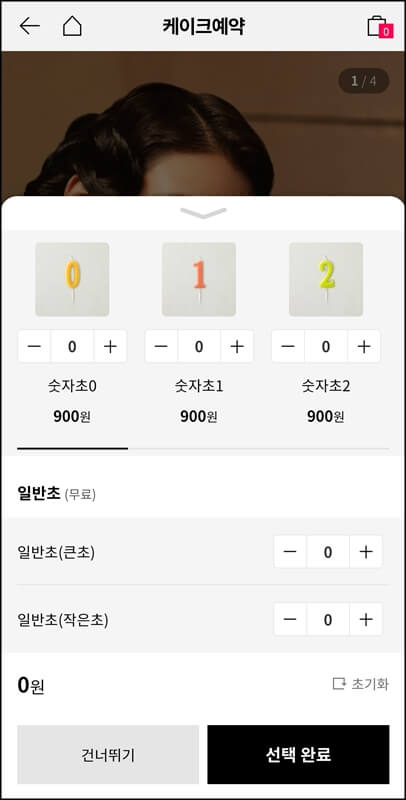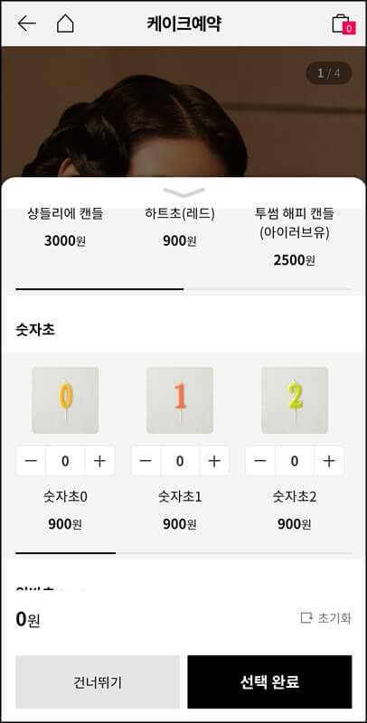 4. 그럼 케이크를 픽업할때 함께 구매할 파티용품 및 초를 선택하면 되는데요~ 파티용품, 디자인초, 숫자초는 비용이 있고, 일반초는 무료로 제공되니까 필요한 용품들을 고르고 선택완료 버튼을 클릭하세요.