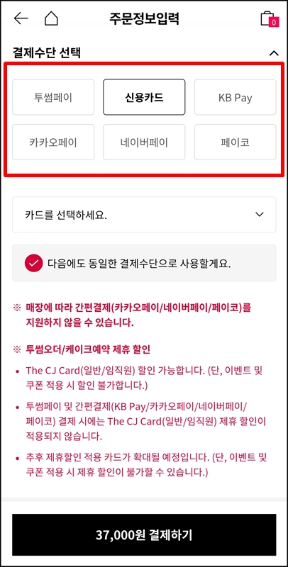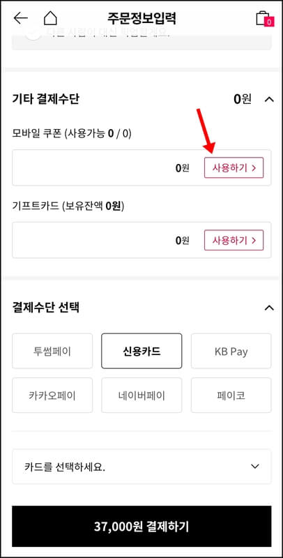 8. 기프티콘을 적용했을 때 비용이 오버되었다면 결제수단을 선택하여 추가 결제를 진행하면 되고, 기프티콘 적용 없이 진행한다면 마찬가지로 결제수단을 선택한 뒤 결제하기 버튼을 누르고 진행하면 돼요.