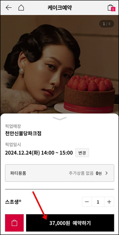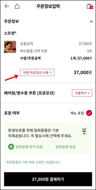 5. 추가한 용품들과 예약한 케이크 가격을 확인하고 예약하기 버튼을 클릭 후 투썸 할인 쿠폰이 있다면 쿠폰/프로모션 사용을 클릭한 뒤 적용시켜 주세요.