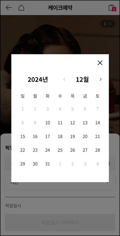 3. 매장까지 선택을 했다면 투썸 케이크 예약후 픽업할 날짜와 시간을 선택한 뒤 픽업일시 선택하기 버튼을 클릭하세요.