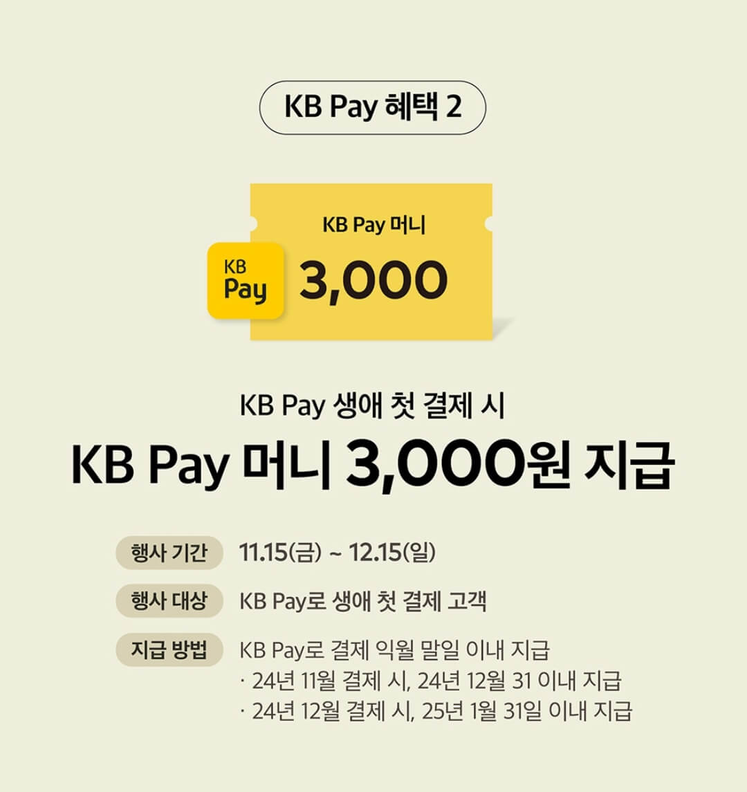 그리고 결제할때 KB Pay로 결제하면 추가 할인을 적용받을 수 있고, 여기에 KB Pay 머니로 생애 첫 결제를 하는 것이라면 3,000원도 추가로 지급받을 수 있어요.