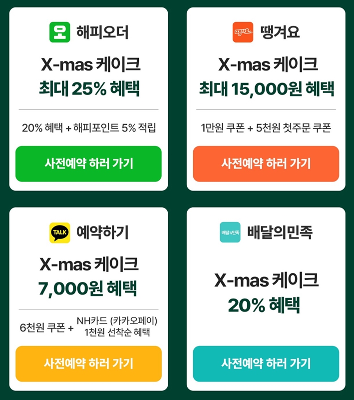 해피포인트에서 해피오더로 사전예약 시에는 20% 할인과 해피포인트 5% 적립을 받을 수 있고, 땡겨요 어플에서 파리바게트 케이크 예약시에는 최대 15,000원을 할인받을수 있으며 카카오톡 예약하기를 통해 예약하면 7,000원 할인 혜택, 배달의 민족으로 예약하면 20% 할인 혜택을 받을수 있어요.