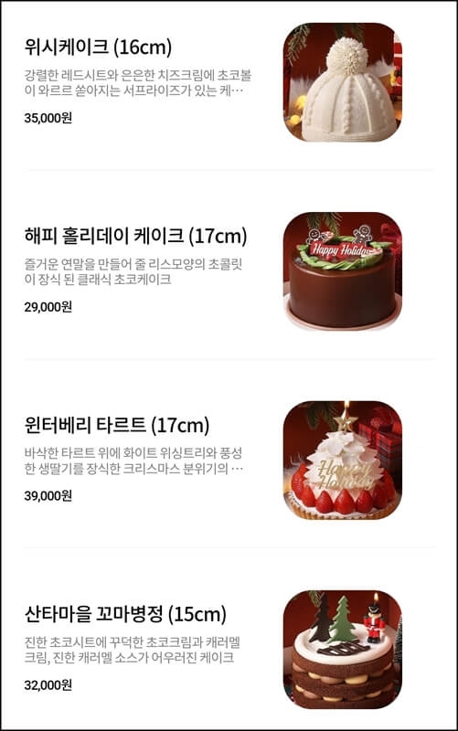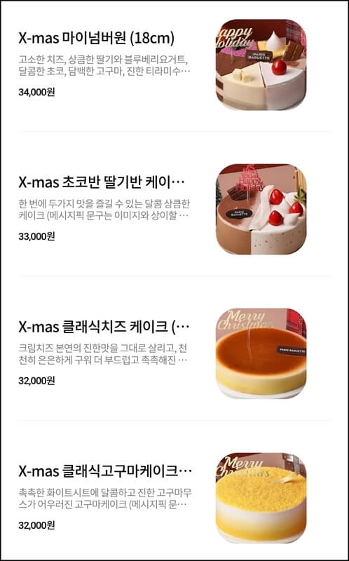 파리바게뜨 케이크 가격은 2만 원 후반대부터 3만 원 중반대인데요~ 2만원 후반대는 해피 홀리데이 케이크밖에 없고, 대부분 3만원 초중반대 가격이라고 생각하면 돼요.