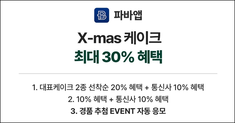 파리바게뜨 크리스마스 케이크 사전예약은 파바앱, 해피오더, 땡겨요, 11번가, 네이버에서 할 수 있는데요~ 파바앱에서는 대표케이크 2종 선착순 20% 할인 + 통신사 10% 할인 혜택으로 최대 30% 할인 가격으로 구매할 수 있고, 대표케이크가 아닌 케이크는 20% 할인 가격으로 구매할수 있어요.