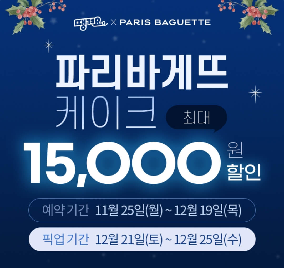 파리바게뜨 케이크 예약 기간은 11월 20일부터 시작하여 12월 19일까지이고, 픽업기간은 12월 21일(토) ~ 12월 25일(수) 까지라고 해요. 단, 예약할 수 있는 루트에 따라서 사전예약 기간 및 픽업 기간이 달라질 수도 있으니 참고하세요.