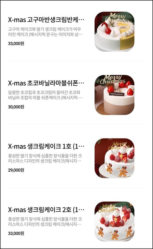 파리바게뜨 케이크 가격은 2만 원 후반대부터 3만 원 중반대인데요~ 2만원 후반대는 해피 홀리데이 케이크밖에 없고, 대부분 3만원 초중반대 가격이라고 생각하면 돼요.