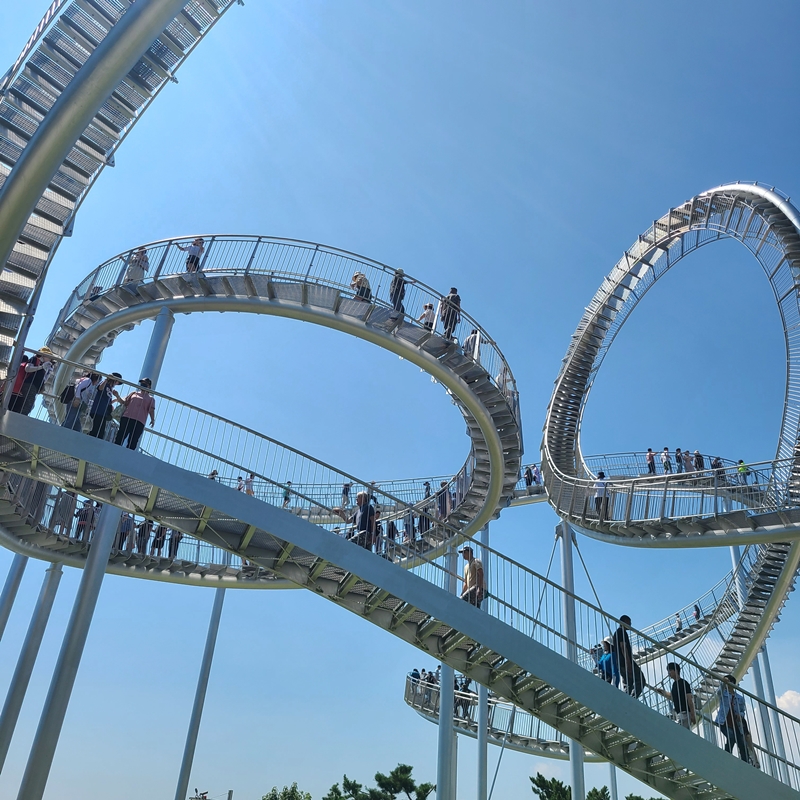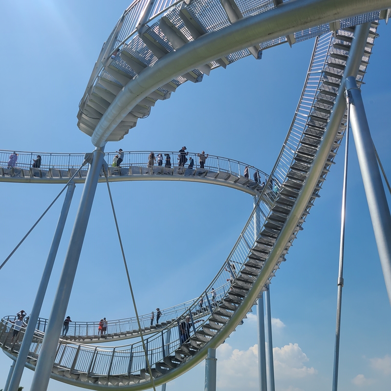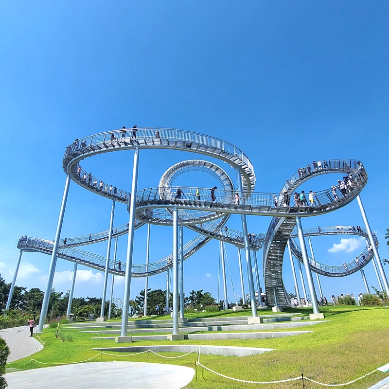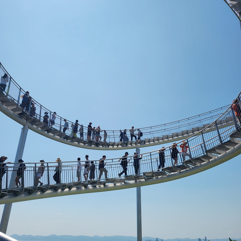 포항 스페이스워크는 흡사 롤러코스터가 떠오르는 계단식으로 된 건물인데요~ 고도 65m 높이로 굉장히 높고 폭이 좁기 때문에 사람이 많을수록 또는 바람이 불수록 계단이 흔들리기도 하고, 아래가 다 보이다 보니 고소공포증이 있는 저는 조금 올라가다가 포기하고 내려왔어요.