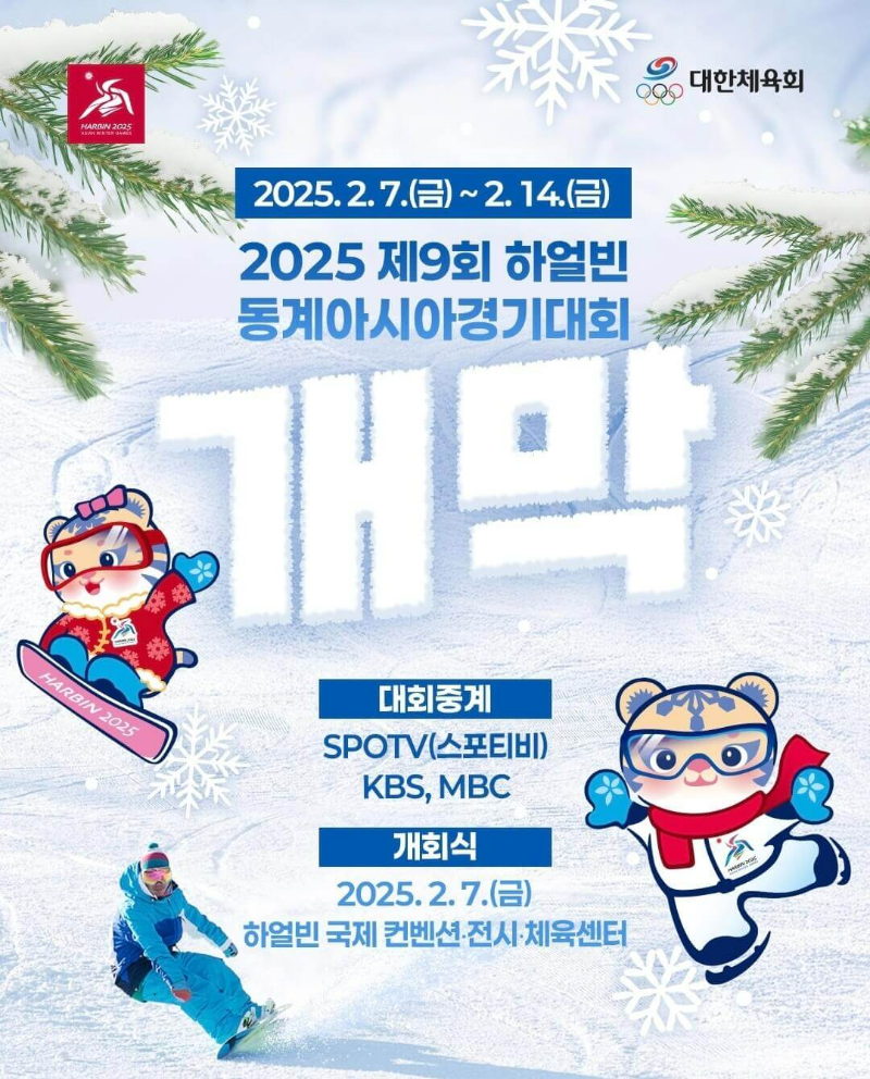 하얼빈 동계 아시안게임 일정은 2월 7일부터 2월 14일까지 진행되는데요~ 이미 4일부터 예선 경기를 시작한 종목들이 있지만 개회식은 우리나라 시간으로 7일(금)인 오늘 밤 9시에 시작된다고 해요.