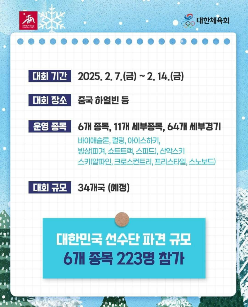 대회 종목으로는 크게 6개 종목으로 진행되고, 11개의 세부종목과 64개의 세부경기로 진행된다고 해요. 종목으로는 바이애슬론, 컬링, 아이스하키, 피겨, 쇼트트랙, 스피드, 산악스키, 알파인, 크로스컨트리, 프리스타일, 스노보드 등이 있고, 한국 선수단은 6개 종목에 총 223명의 선수들이 참가한다고 해요.