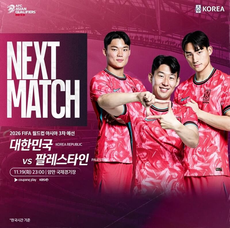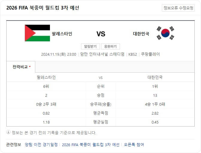 앞서 말했듯이 한국 팔레스타인 축구 중계 방송은 11월 19일(화) 밤 11시에 시작되는데요~ 이번 경기는 KBS2 채널과 쿠. 플에서 시청할 수 있는데 월드컵 아시아 예선 모든 경기는 공중파 3사와 쿠. 플에서 생중계되고, 쿠. 플에서는 정식경기 30분 전부터 프리뷰쇼를 시작하니 참고하세요.