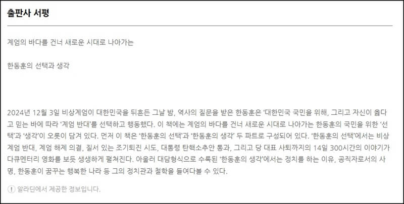 이 책에는 대한민국을 위해 그리고 자신이 옳다고 믿는 바에 따라 계엄 반대, 계엄 해제 의결, 질서 있는 조기퇴진 시도, 대통령 탄핵소추안 통과 그리고 당 대표 사퇴까지의 14일 300시간의 이야기가 담겨있어 흡사 다큐멘터리 영화를 보는 듯 펼쳐진다고 해요.