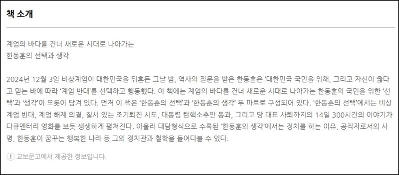 한동훈 책 예약이 시작된 국민이 먼저입니다는 대한민국의 정치적 슬로건 중 하나이기도 한데요~ 무엇보다 계엄의 바다를 건너 새로운 시대로 나아가는 한동훈의 국민을 위한 선택과 생각이 오롯이 담겨있다고 소개되어 있어요. 사실 국민이 먼저입니다 라는 슬로건은 한동훈 전 대표가 정치활동을 하면서 꾸준히 강조해 왔던 핵심 가치인데 국민의 목소리에 귀를 기울이고 국민의 삶의 질을 향상하기 위한 정책을 추진하겠다는 의지를 나타내고 있는 것이죠~
