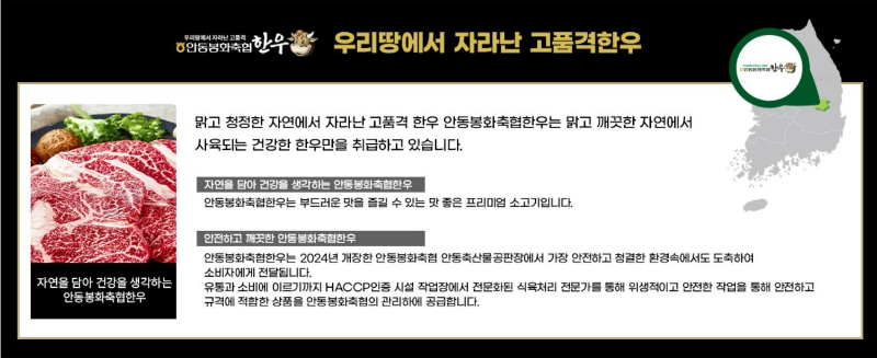 안동봉화축협한우는 맑고 깨끗한 자연에서 사육되는 건강한 한우만 취급하는 브랜드로 부드러운 맛을 즐길 수 있는 프리미엄 소고기라고 해요.
