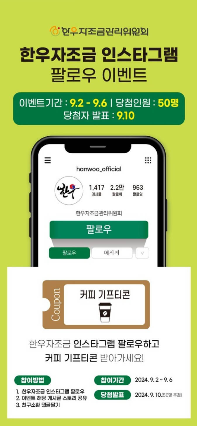 그리고 이번 행사와 맞물려 한우자조금 인스타그램을 팔로우하거나 한우자조금 온라인 장터 홈페이지에 신규가입을 하면 커피 기프티콘을 받는 이벤트도 진행 중이니까 많이 참여해 보셔도 좋을 것 같아요.