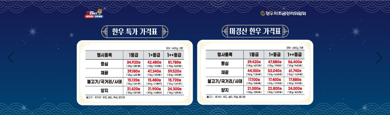 할인판매 가격은 1등급 기준으로 등심 100g당 5,500원 ~ 6,600원 / 양지 100g당 3,190원 ~ 3,760 / 불고기와 국거리는 100g당 2,200원 ~ 2,670원 수준으로 판매하는데 지난해 같은 기간 소비자가격과 비교하더라도 최대 20~40%가 더 저렴한 편이에요.
