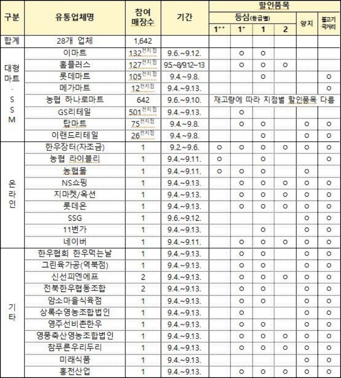 할인대상 품목으로는 대표적 구이류 부위인 등심과 더불어 양지 등 불고기, 국거리류를 1++등급에서 2등급까지 판매한다고 하는데요~ 주력 품목들은 참여하는 업체에 따라서 달라지지만 온라인몰과 농협 하나로마트에서는 등심, 불고기, 국거리 등 다양한 부위로 선보이고, 대형마트에서는 등심을 중심으로 할인행사를 진행한다고 해요.