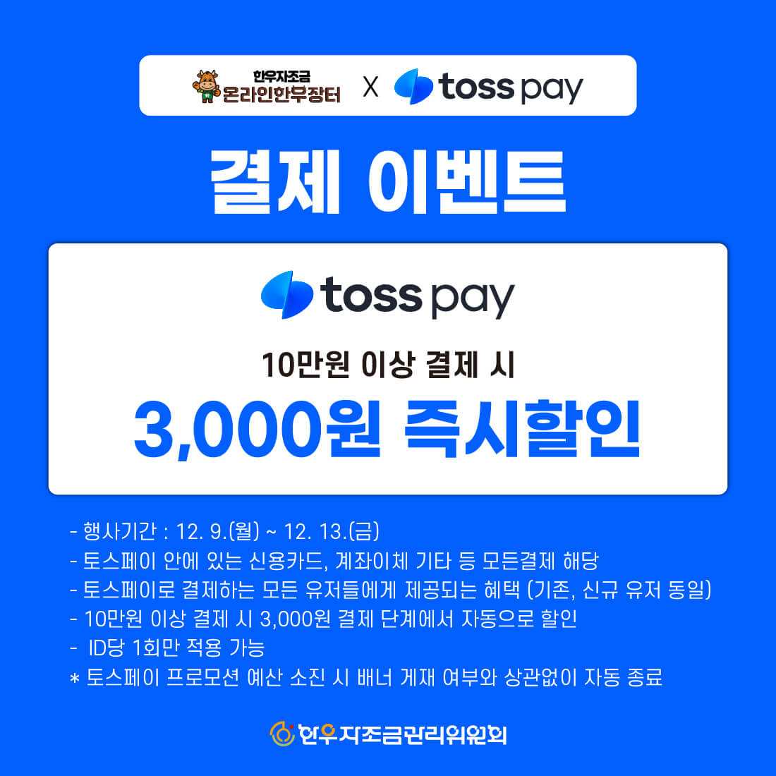 마지막으로 한우 반값 할인 행사 기간 동안 상품을 구매할 때 토스페이로 10만 원 이상 결제하는 모든 분들에게는 3,000원이 결제단계에서 자동으로 할인되니 참고하시고요. 물론 토스페이 안에 있는 신용카드, 계좌이체 기타 등 모든 결제가 해당돼요.