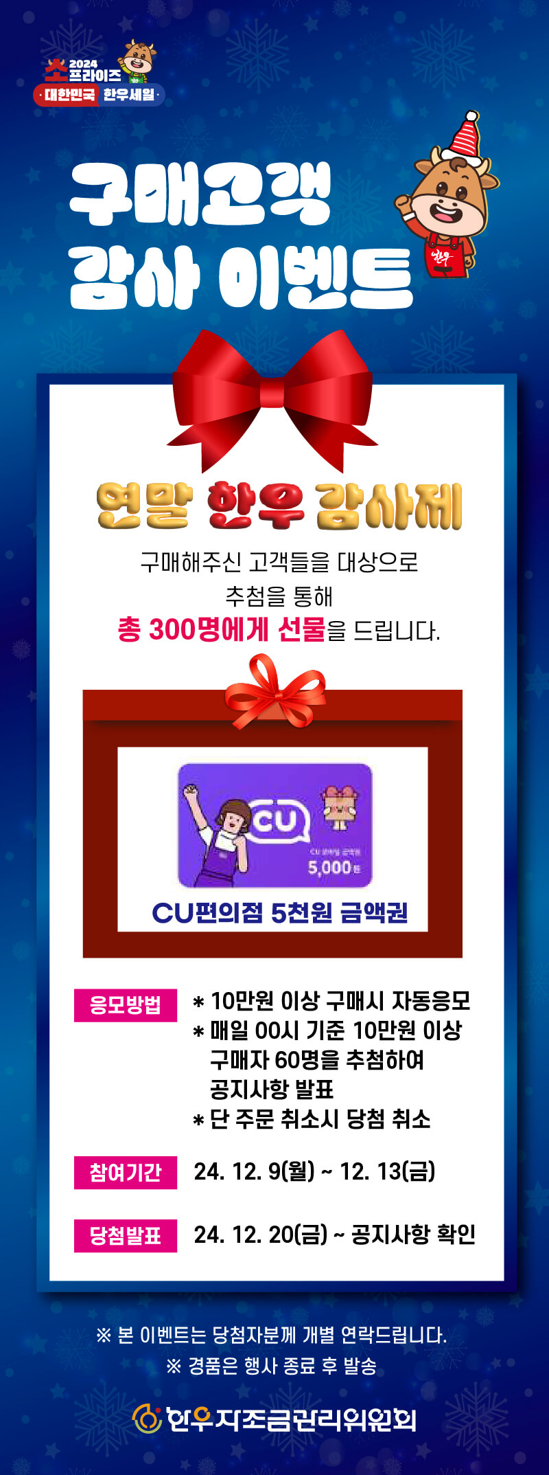 그리고 한우 반값 할인 행사가 시작되면 다양한 이벤트도 진행을 하는데요~ 온라인장터에서 첫 구매한 고객들을 대상으로 추첨을 통해 총 1010명에게 스타벅스 커피쿠폰을 증정하고, 감사 이벤트를 통해서 구매한 고객들을 대상으로 총 300명에게는 CU 편의점 5천 원 금액권을 증정한다고 해요.