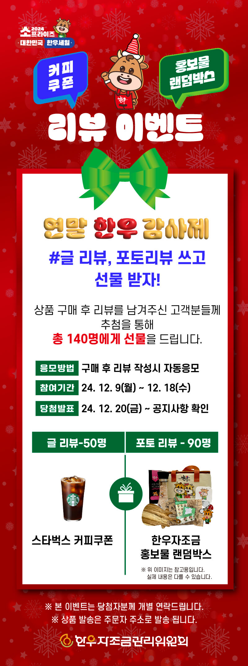 또, 한우 반값 할인 행사동안 상품을 구매하고 리뷰를 남긴 고객들을 대상으로 총 140명에게 리뷰형식에 따라서 스타벅스 커피쿠폰 또는 한우자조금 홍보물 랜덤박스를 증정한다고 하니까 이왕이면 구매 후 리뷰 참여도 해보면 좋을 것 같아요. 그리고 행사기간 내 상품을 구매한 분들 중에서도 합산 금액이 가장 많은 구매자 1명에게는 30만 원 상당의 한우 선물세트를 증정한다고 하고요.