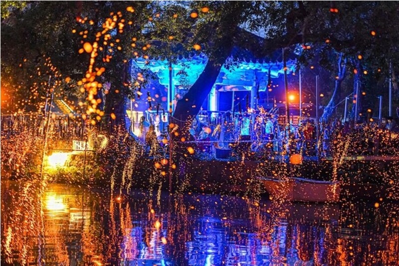 함안 낙화놀이는 매년 석가탄신일에 무진정 일대에서 열리는 축제로 군민의 안녕을 기원하는 뜻에서 열리는 함안 고유의 민속놀이라고해요. 함안 낙화놀이는 연등과 연등사이에 참나무 숯가루로 만든 낙화를 매달아 이 낙화에 불을 붙여 꽃가루처럼 물 위에 날리는 불꽃놀이라고 할 수 있는데요~ 일제강점기에는 민족정기 밀살정책에 따라 중단되었다가 1985년에 복원되어 매년 행사를 실시하여 함안군민의 안녕을 기원하고 있다고 하네요.