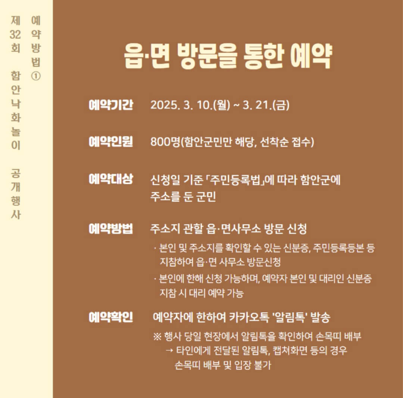 그리고 함안 낙화놀이 예약은 함안군민을 위해 읍. 면 방문을 통한 예약과 전 국민이 가능한 온라인 예약 시스템을 통한 예약으로 진행되는데요~ 함안군민은 21일 날짜로 선착순 예약이 끝났고, 전국민이 가능한 함안 낙화놀이 예약은 3월 26일(수) 오전 10시부터 가능해요.