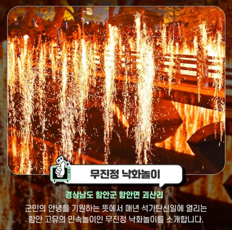 그렇게 군민의 안녕을 기원하는 뜻에서 매년 석가탄신일에 열렸던 함안 낙화놀이는 2008년 10월에 경상남도 무형유산으로 지정되었고, 다수의 드라마와 예능 프로그램을 통해서 알려지기도 했지만 SNS를 통해서 더 많은 사람들이 함안 낙화놀이에 대해서 알게 된 것 같아요.