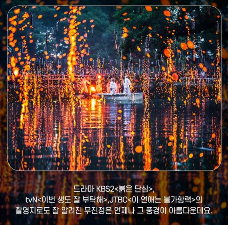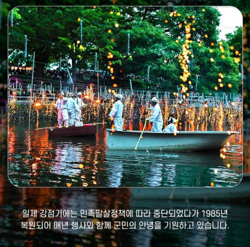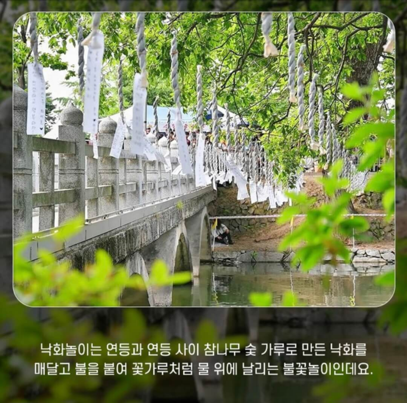 낙화놀이는 연등과 연등 사이 참나무 숯가루로 만든 낙화를 매달고 불을 붙여 꽃가루처럼 물 위에 흩날리는 불꽃놀이인데요~ 일제강점기에는 민족말상정책에 따라 중단되었다가 1985년에 복원되어 매년 행사와 함께 군민의 안녕을 기원하고 있다고 해요.