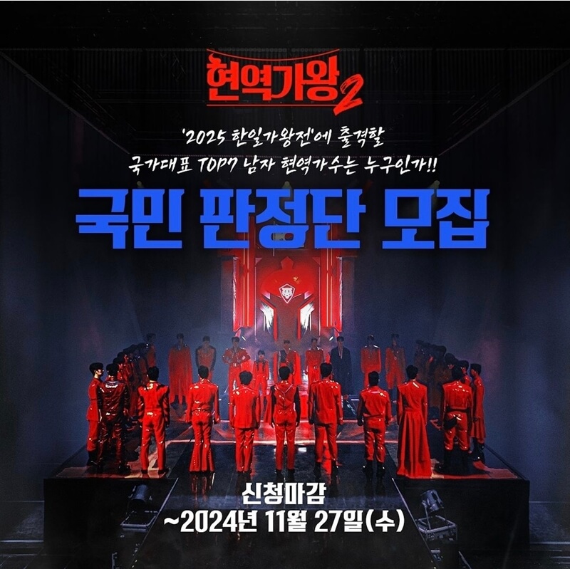 현역가왕2 국민판정단 모집은 24년 11월 27일(수)까지 하면 되고, 녹화는 24년 12월 3일(화) 오전, 오후에 진행된다고 하는데요~ 당첨자 발표는 24년 11월 29일(금)부터 당첨자분들에 한해 개별 연락이 간다고 하니까 신청한번 해보셔도 좋을것 같아요.