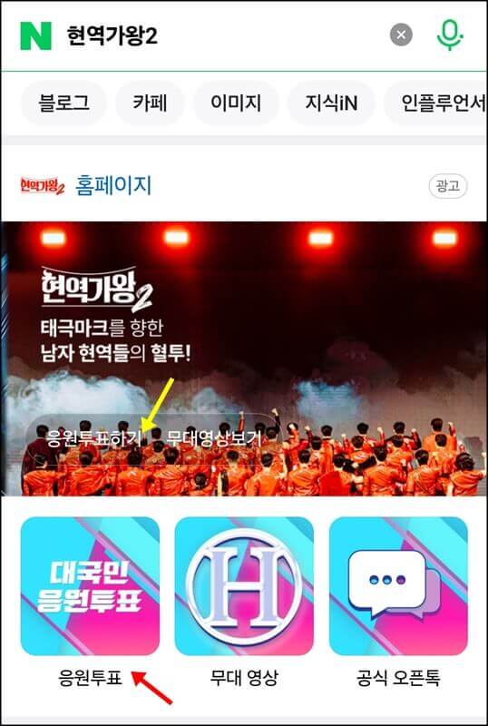 먼저 현역가왕2 투표하기는 네이버 아이디로 진행이 되는데요~ 네이버 검색창에 '현역가왕'을 검색 후 대국민 응원투표 버튼을 누르고 들어가서 투표를 진행하면 돼요.