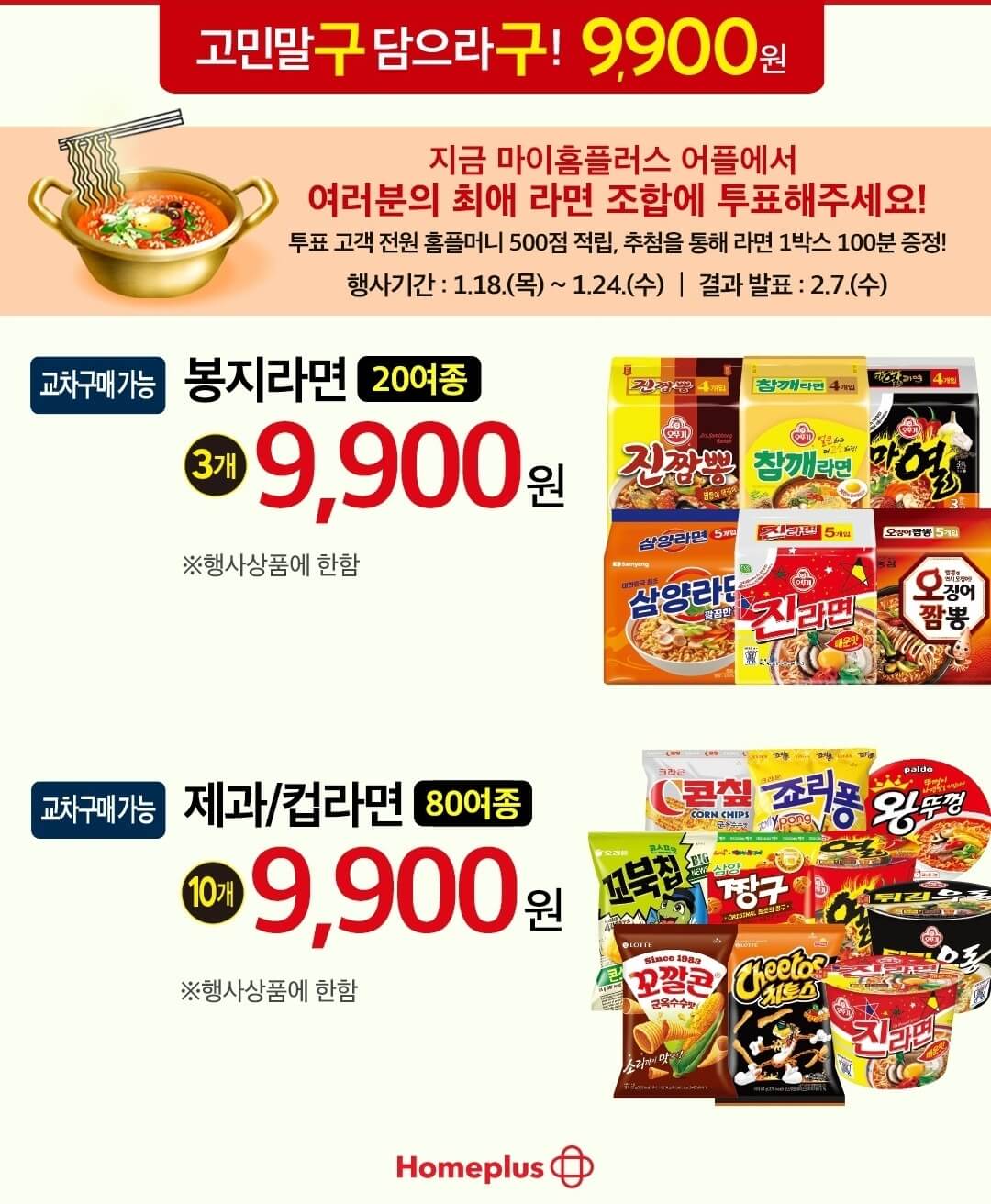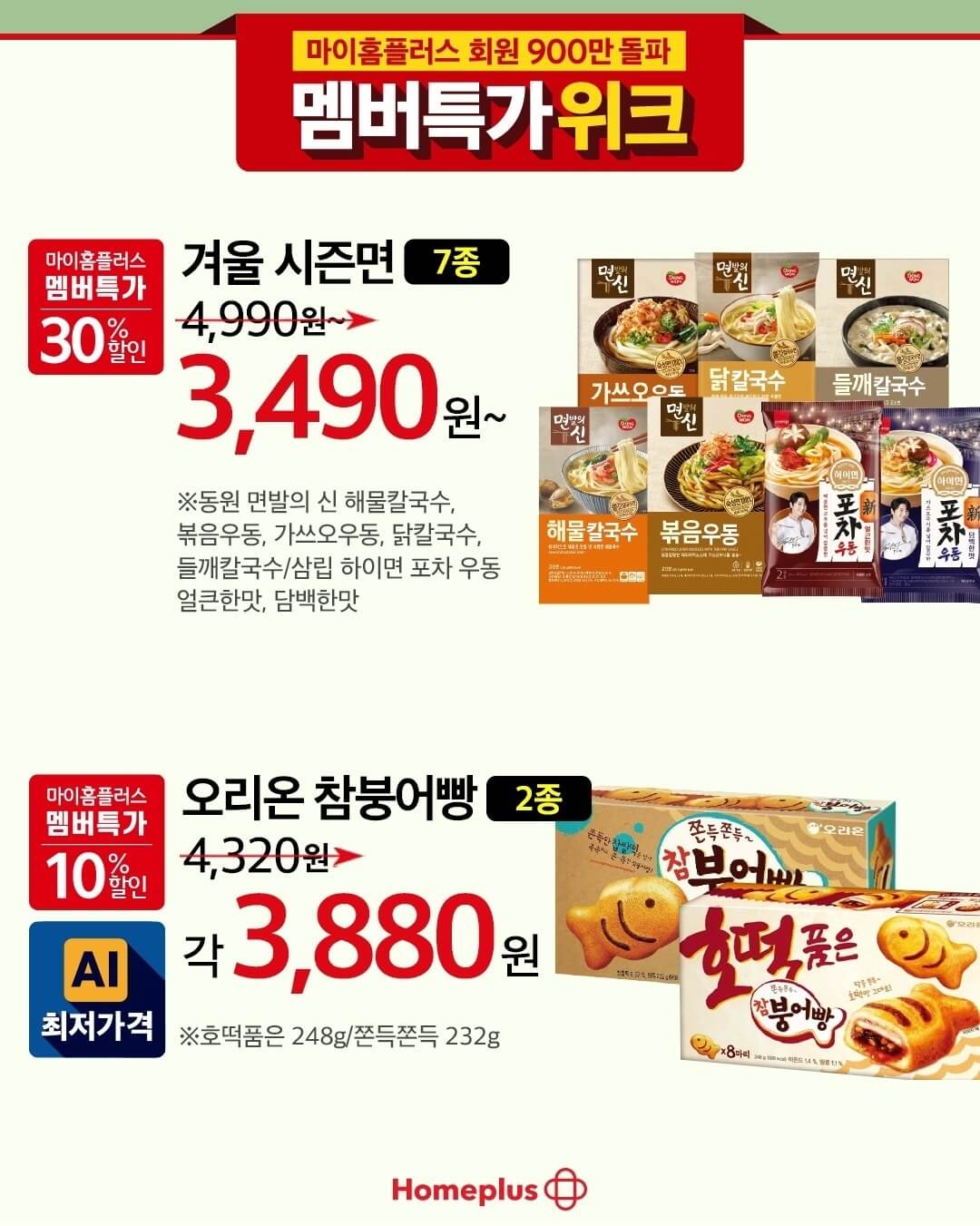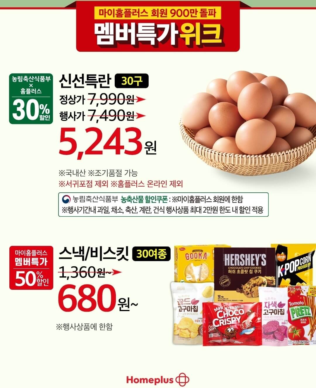 그리고 요즘 계란이 거의 7천 원 중후반대 가격으로 형성되어 있는데 명절 앞두고 이 가격이 너무 부담되잖아요? 그런데 홈플러스 전단 행사를 통해서 신선특란 30구에 행사가격에서 더 내린 5,243원에 구매할 수 있고, 간식류 및 겨울 시즌 면류를 최소 30% ~ 50% 할인된 가격으로 만나볼 수 있어요.