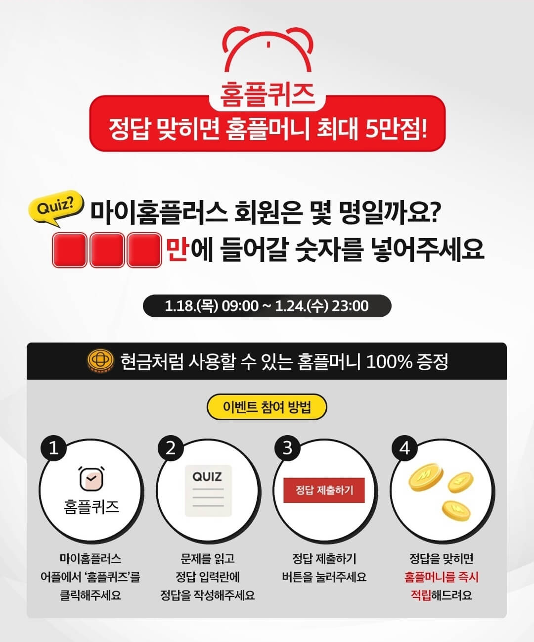 이 외에도 홈플퀴즈 문제를 맞히면 현금처럼 사용할 수 있는 홈플머니를 100% 증정하고 이 모든 이벤트가 종료되는 다음날인 25일부터 31일까지 또 다른 특별한 이벤트가 계속된다고 하니 기대해 봐도 좋을 것 같아요.
