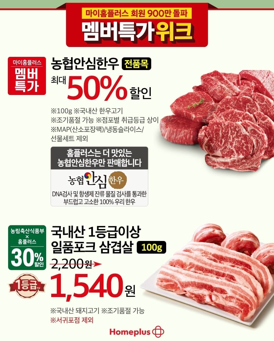 1월 24일(수)까지 진행하는 멤버특가 위크 홈플러스 전단 행사 주요 품목들을 보면 농협 안심한우 전품목을 50% 할인된 가격에 만나볼 수있고, 국내산 1등급 이상의 일품 포크 삼겹살을 30% 할인된 가격으로 만나볼수 있어요. 그리고 요즘 딸기 가격도 꽤 비싼 걸로 알고 있는데요~ 지리산 설향딸기와 새벽딸기 500g을 30% 할인된 가격으로 선보이고 노르웨이 생연어 구이용과 횟감용 100g을 40% 할인된 가격으로 선보이고 있어요.
