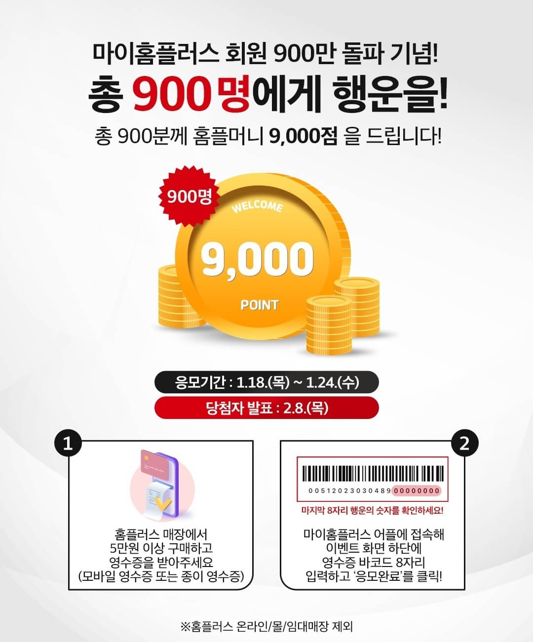 그리고 또 홈플러스 매장에서 5만원 이상 구매하고 받은 영수증으로 장보기를 인증하면 900명을 추첨하여 홈플머니 9,000점도 증정한다고 하니까 혹시라도 홈플러스 오프라인 매장에서 5만 원 이상의 장을 봤다면 꼭! 참여해 보세요.