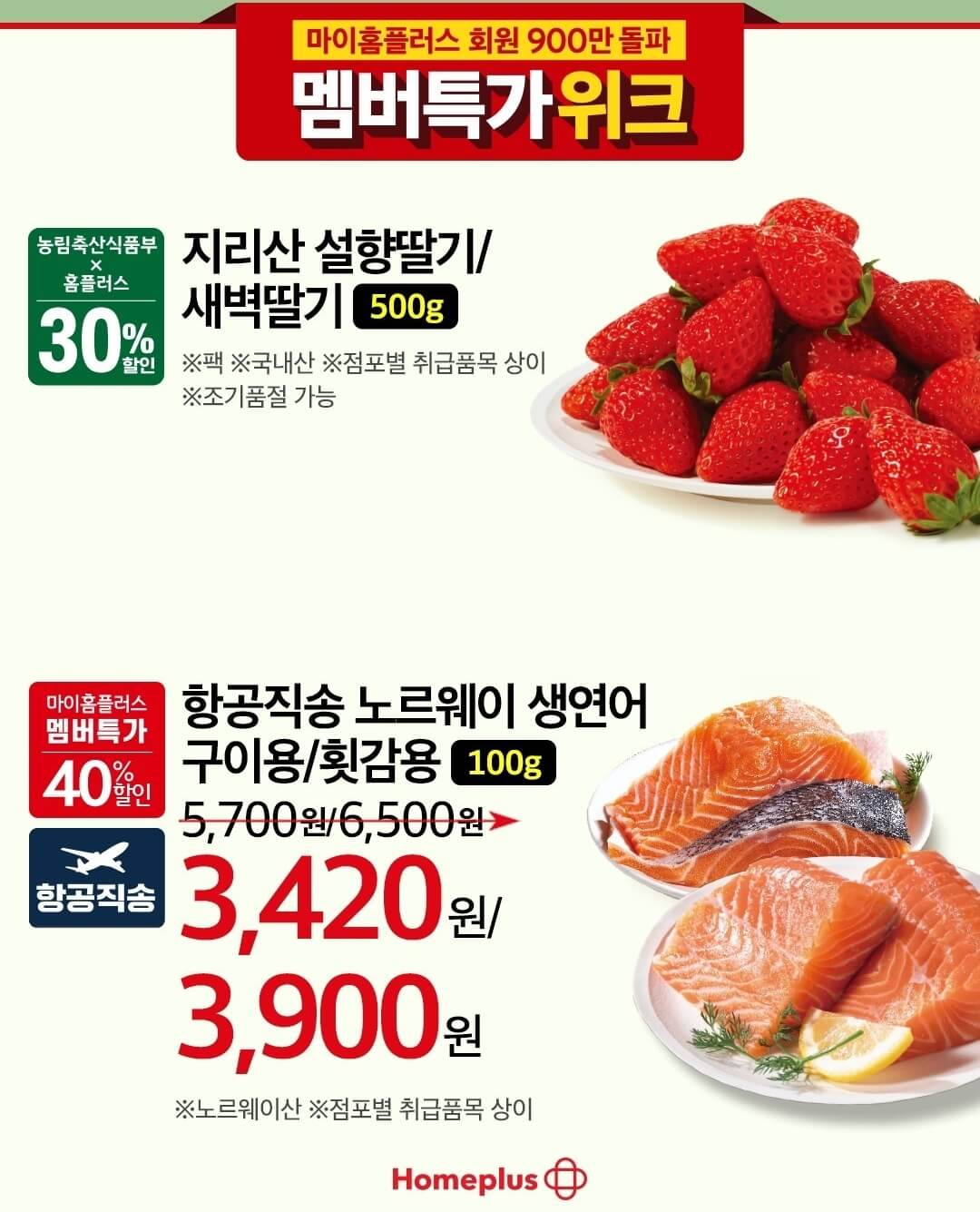 1월 24일(수)까지 진행하는 멤버특가 위크 홈플러스 전단 행사 주요 품목들을 보면 농협 안심한우 전품목을 50% 할인된 가격에 만나볼 수있고, 국내산 1등급 이상의 일품 포크 삼겹살을 30% 할인된 가격으로 만나볼수 있어요. 그리고 요즘 딸기 가격도 꽤 비싼 걸로 알고 있는데요~ 지리산 설향딸기와 새벽딸기 500g을 30% 할인된 가격으로 선보이고 노르웨이 생연어 구이용과 횟감용 100g을 40% 할인된 가격으로 선보이고 있어요.