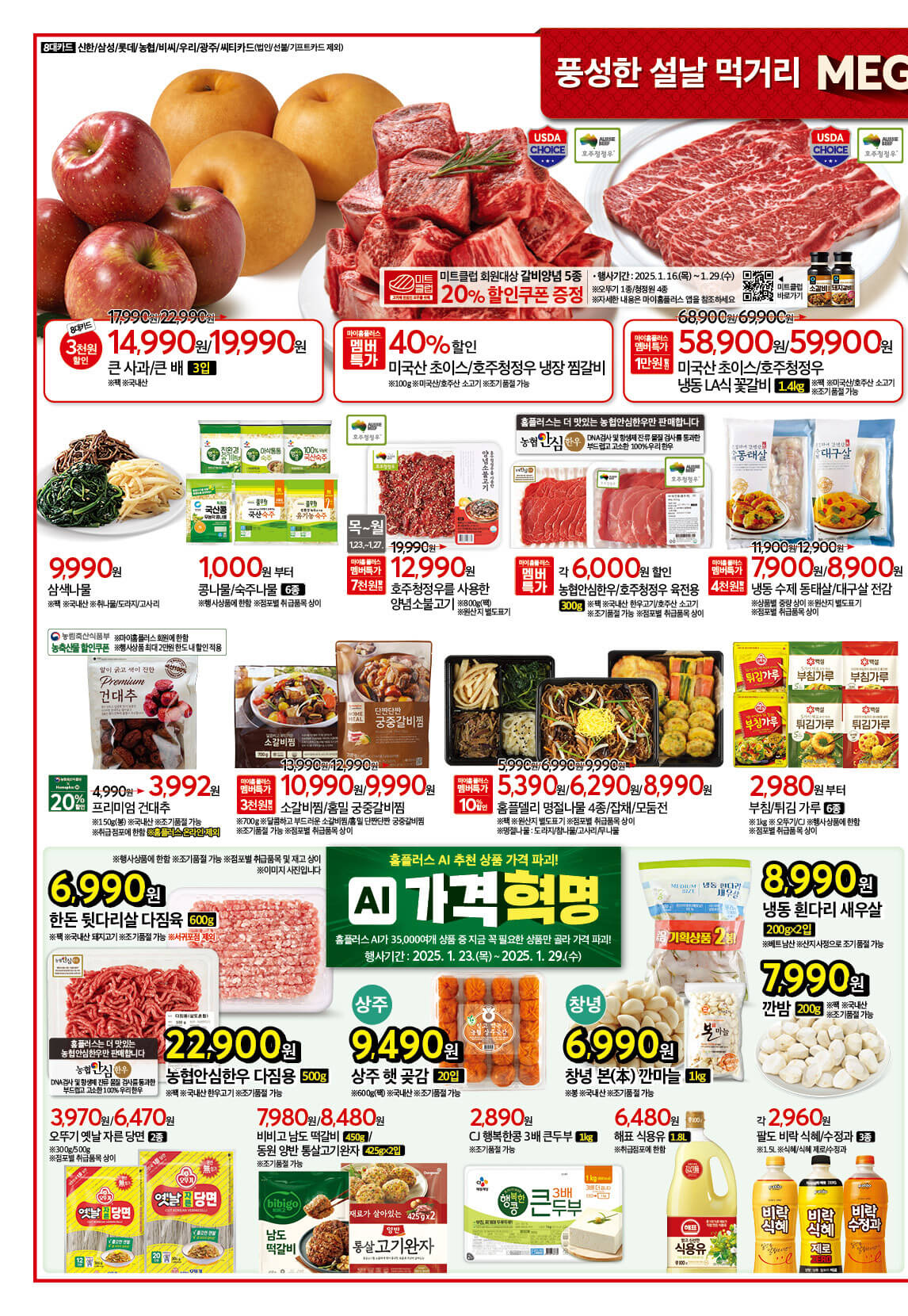 홈플러스 전단행사에는 안 보이지만 멤버십 회원들에게 1kg짜리 당근 1봉을 50% 할인된 3,990원에 선보이고, 육류뿐만 아니라 과일, 전류, 떡국떡 등 다양한 명절 필수품을 특별 가격에 선보이고 있어요.