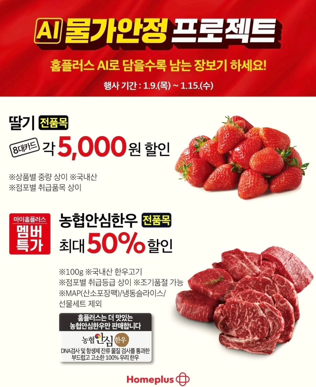 홈플러스 전단 상품을 살펴보니까 딸기 전품목을 8대 카드로 결제하면 5,000원 할인받을 수 있고, 12 브릭스 맛난이 사과 1.5kg는 3천 원 할인받아 구매할 수 있어요. 그리고 홈플러스 회원가입을 하신 분들은 농협안심한우 전품목을 최대 50% 할인가로 구매할 수 있고, 보먹돼 삼겹살과 목심은 40% 할인가로 구매할 수 있고요.
