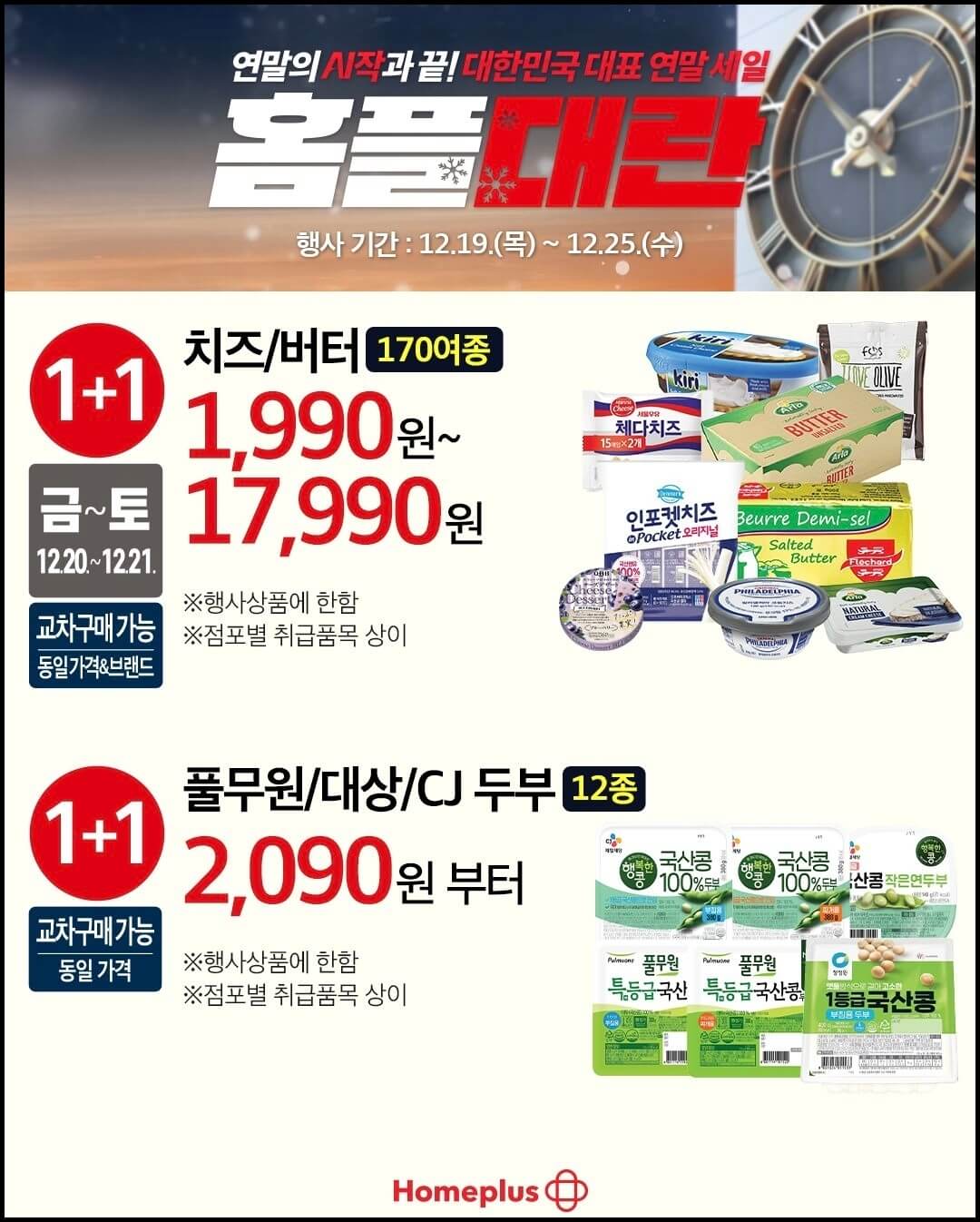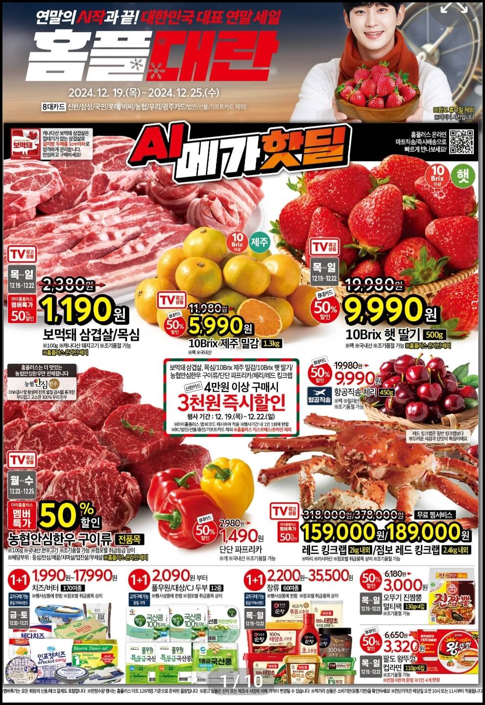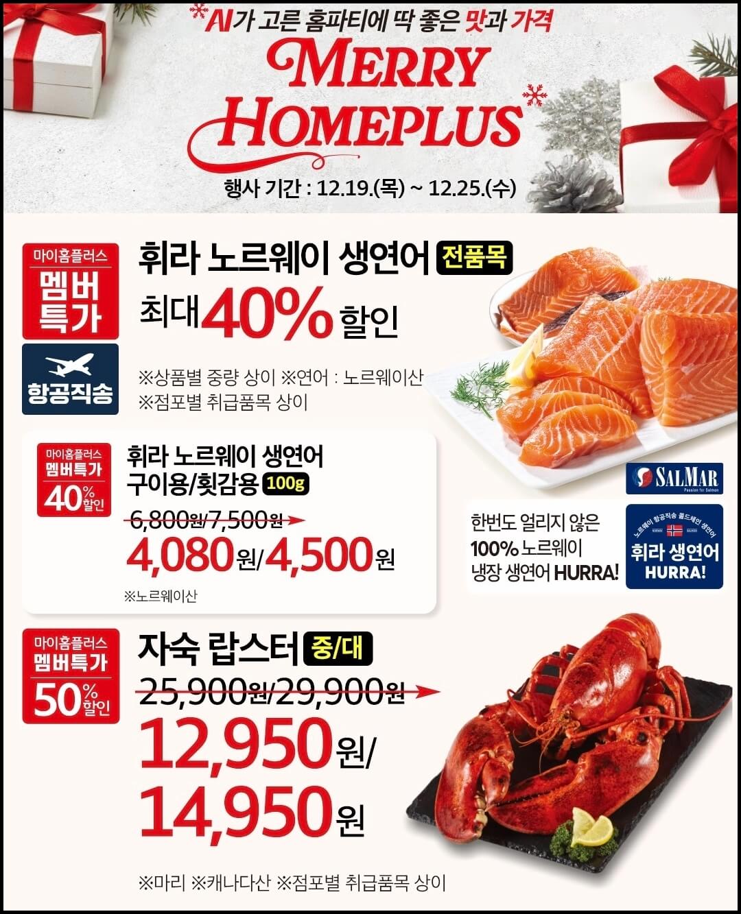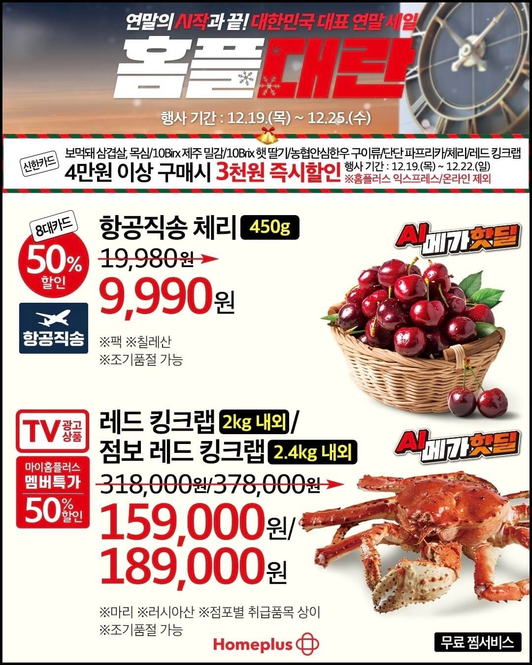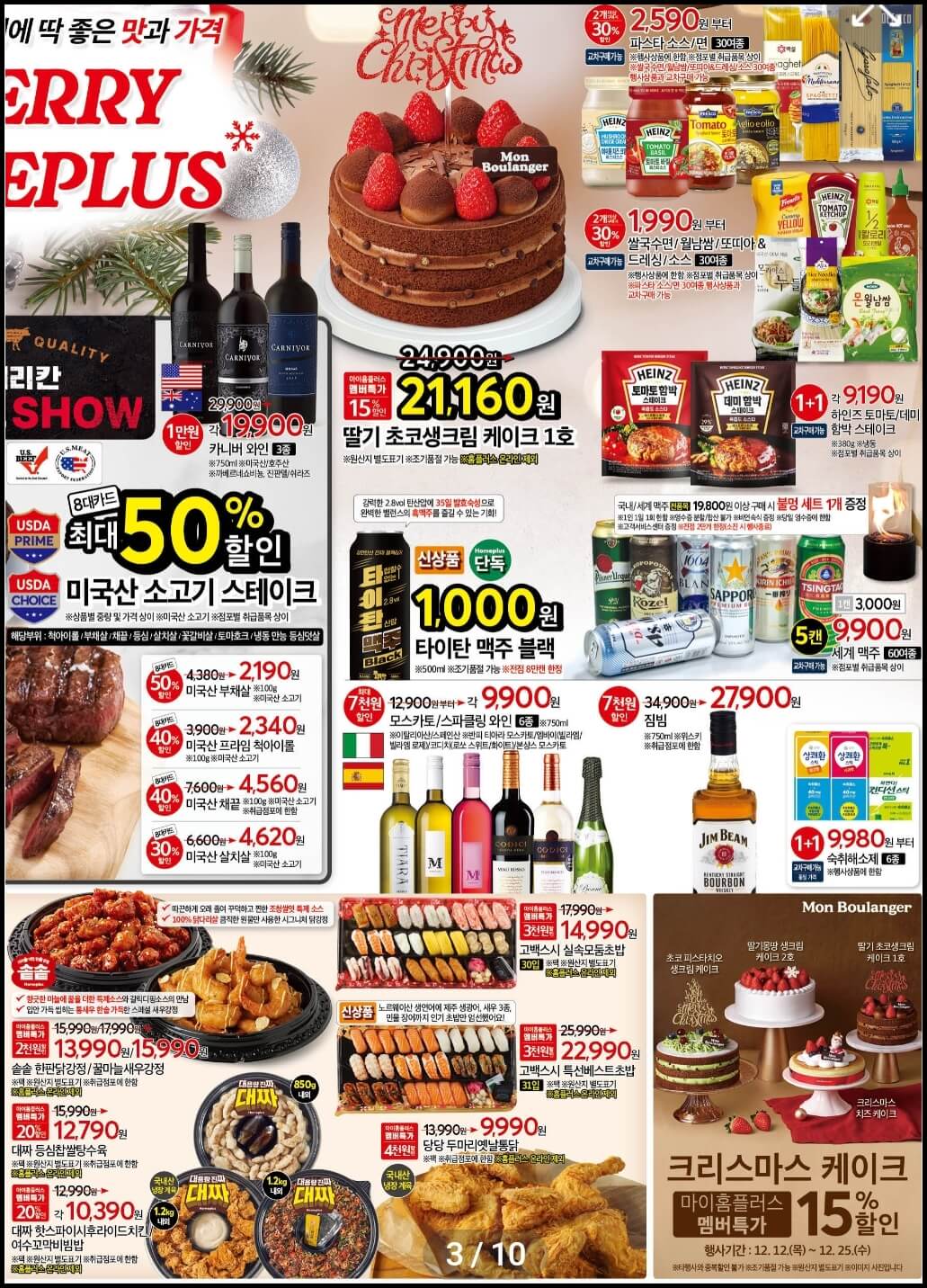 11월 28일부터 시작되었던 홈플러스 홈플대란이 12월 25일에 막을 내립니다. 그렇다 보니 오늘 올려드리는 홈플러스 홈플대란 전단지는 마지막주 인터넷 전단지가 될 텐데요~ 마지막 연말세일인 만큼 케이크부터 킹크랩, 스테이크까지 대폭 할인하니까 마지막주 홈플대란도 놓치지 마세요.