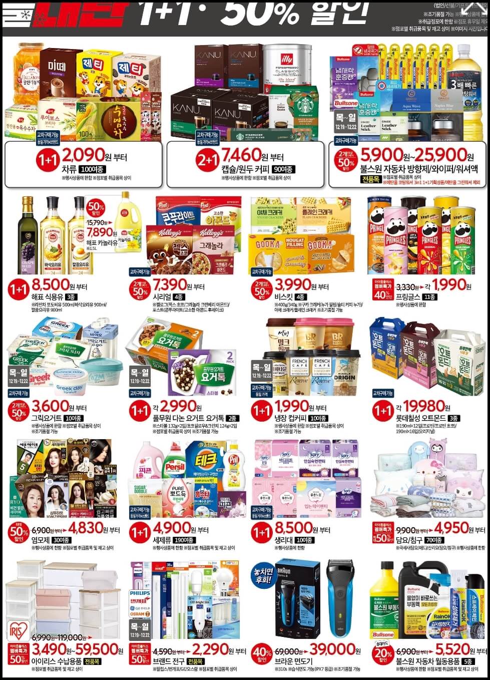 그리고 이밖에도 모든 식품 카테고리에서 1+1 또는 최대 50% 할인 혜택을 선사하는데요~ 20 일부터 21일까지는 치즈와 버터 150여 종을 1+1으로 판매하고, 19일부터 22일까지는 장류 60여 종을 1+1에 제공한다고 해요. 그리고 파스타 소스. 면 30여 종과 쌀국수면, 월남쌈. 토르티야 & 드레싱. 소스와 수입 올리브유 8종은 2개 이상 구매 시 30% 할인가로 구매할 수 있어요.