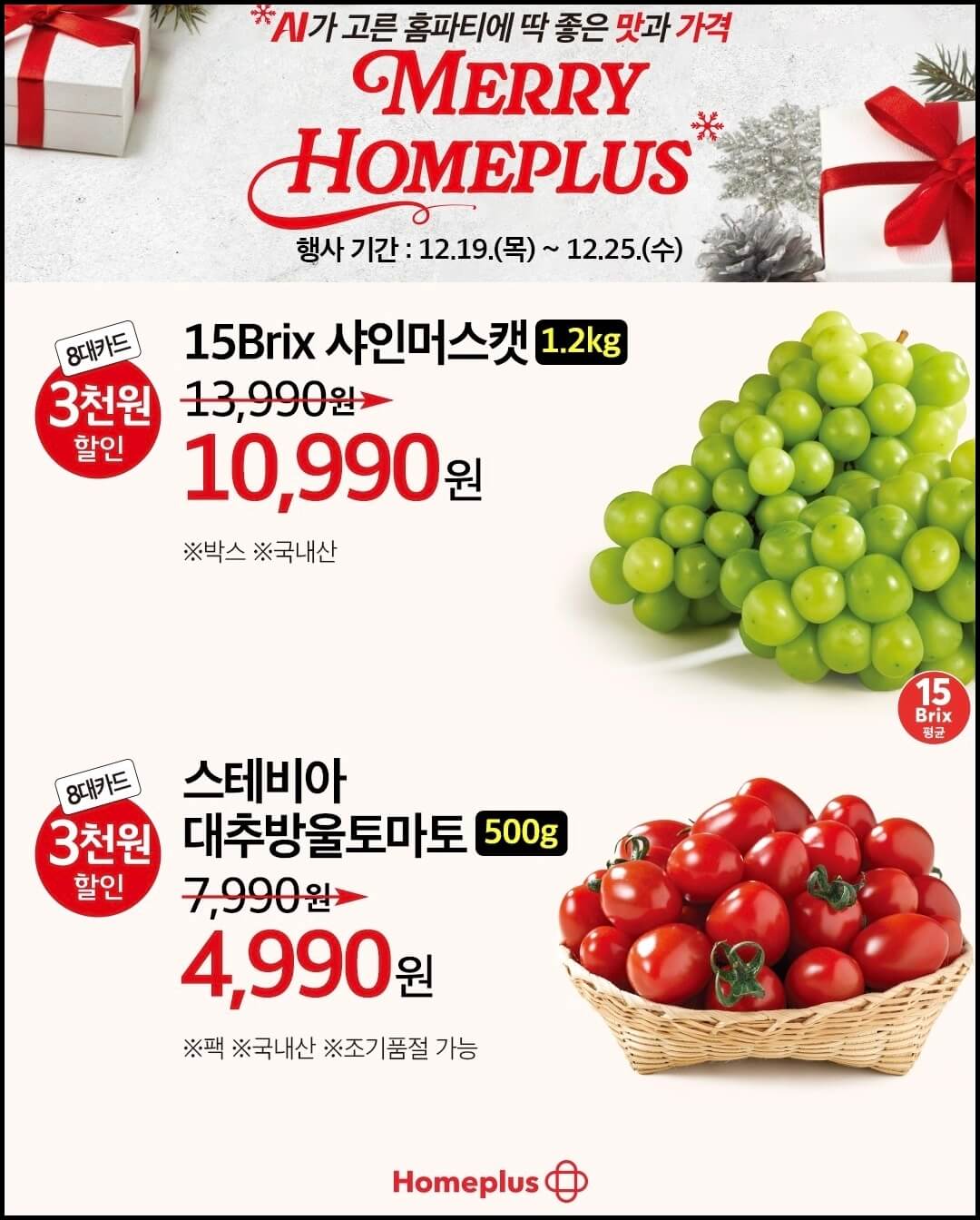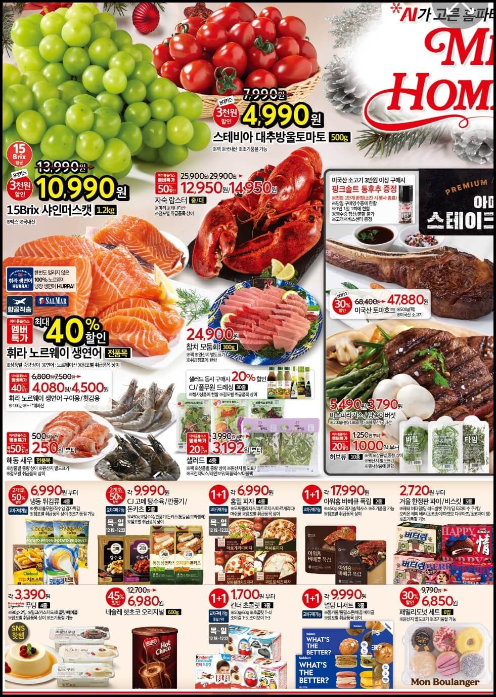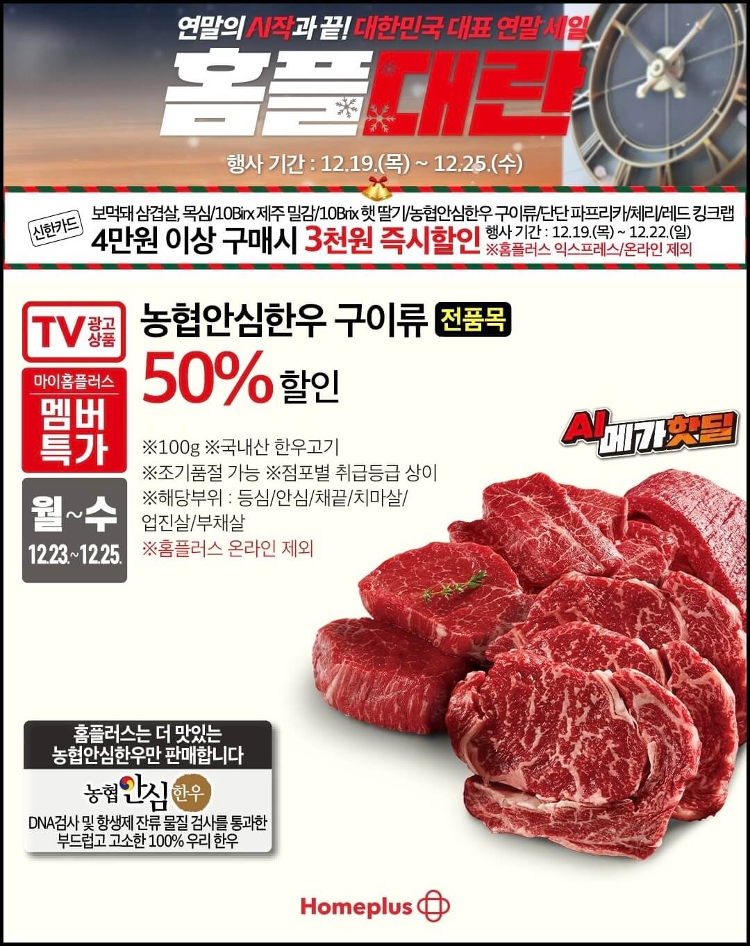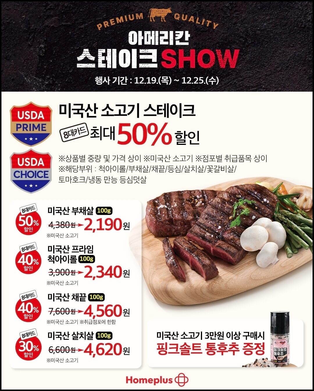 그리고 단 일주일 남은 크리스마스를 맞이해서 홈파티에 딱 어울리는 메리 홈플러스 행사도 진행하는데요~ 메리 홈플러스 행사도 함께 진행하는데요~ 아메리칸 스테이크쇼를 통해 미국산 토마호크를 8대 카드로 결제 시 30% 할인가격으로 구매할 수 있고, 다양한 부위의 미국산 소고기 스테이크도 8대 카드로 결제시 최대 50% 할인가로 구매할수 있어요.