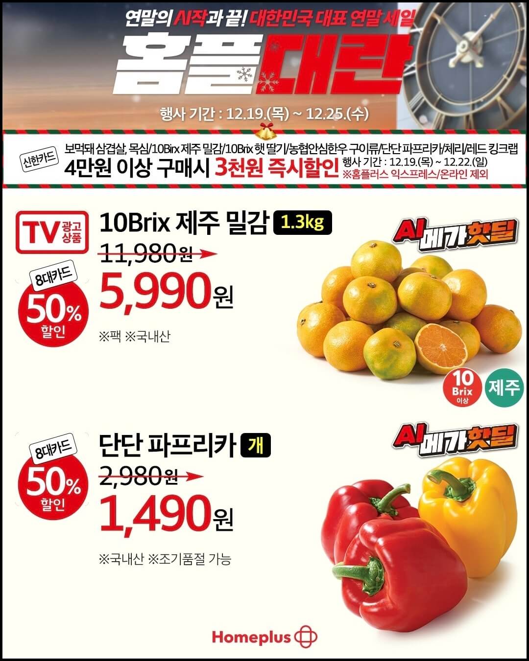 홈플대란이 시작되고 나서 매주 AI가 픽하는 메가 핫딜 품목들이 있었는데요~ 이번주 AI 메가핫딜 품목으로는 밀감, 체리, 파프리카, 삼겹살, 목심, 킹크랩, 햇딸기, 농협안심한우가 선정되었어요. 이렇게 AI 메가핫딜 품목을 12월 22일까지 신한카드로 4만 원 이상 구매하면 3,000원 추가 할인도 받을 수 있으니까 참고하세요.