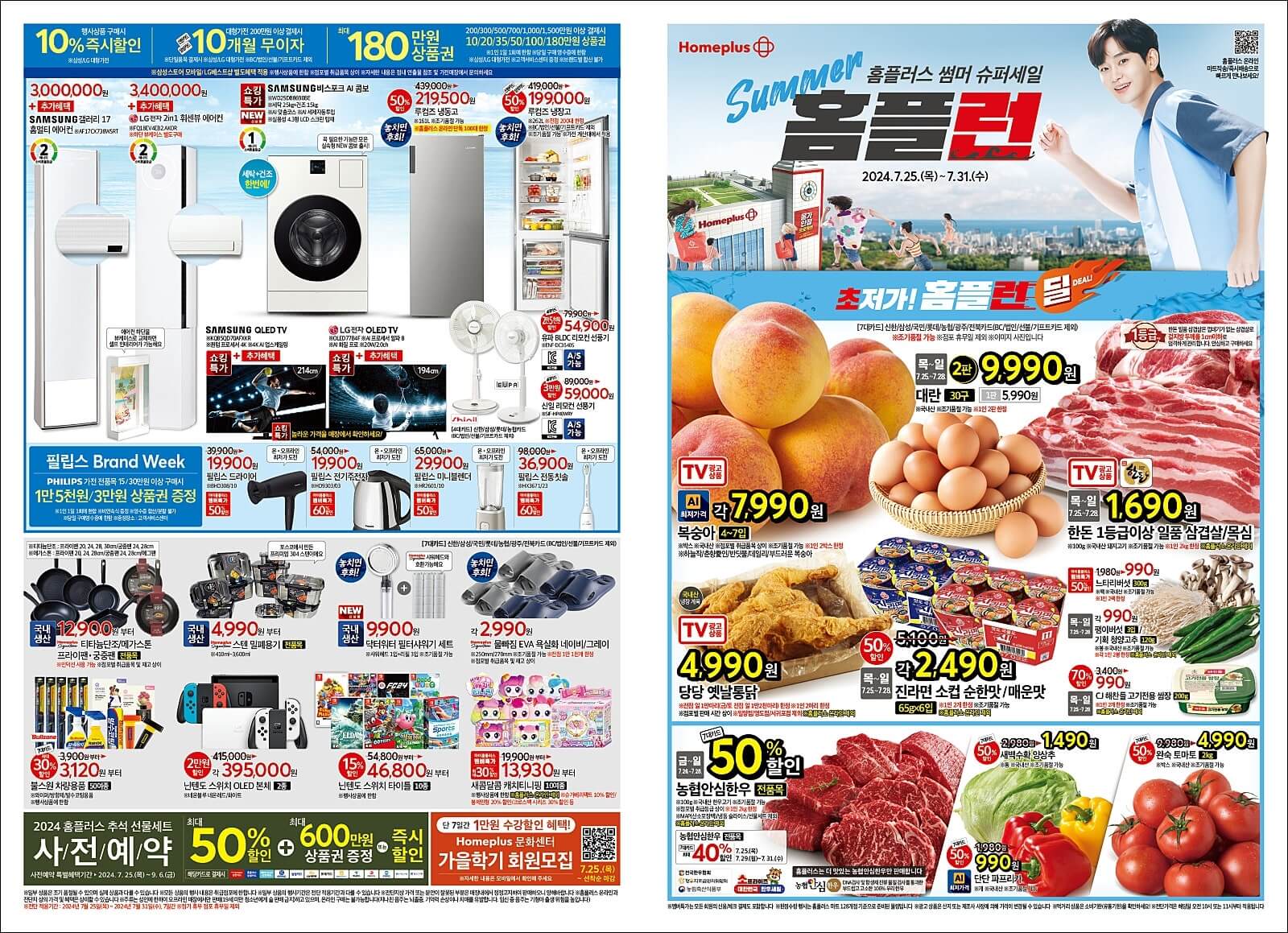 홈플러스 썸머 슈퍼세일 홈플런 행사는 7월 25일부터 8월 14일까지 3주 동안 진행되며 7월 23일부터 24일까지는 사전행사가 진행돼요. 그리고 아래에 올려드리는 홈플러스 홈플런 전단은 7월 25일(목)부터 7월 31일(수)까지의 행사 품목들이니 참고하세요.