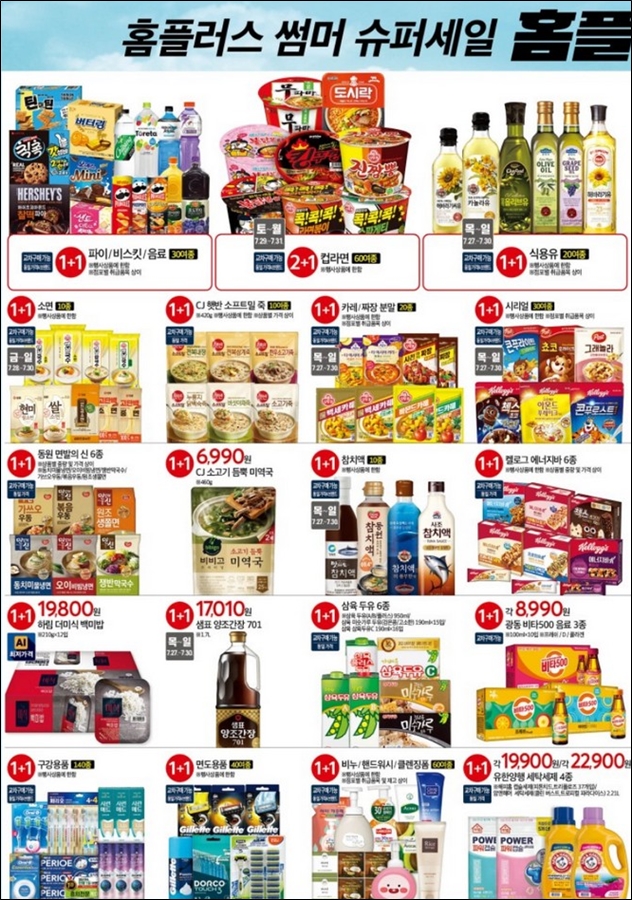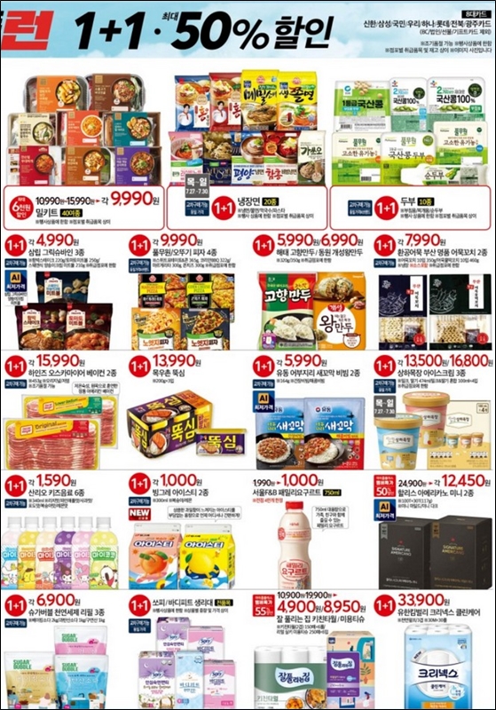 - 1+1 품목 : 7월 27일(목) ~ 30일(일) - 식용유, 냉장면, 시리얼, 참치액, 상하목장우유, 장류, 유부초밥, 과자, 양말