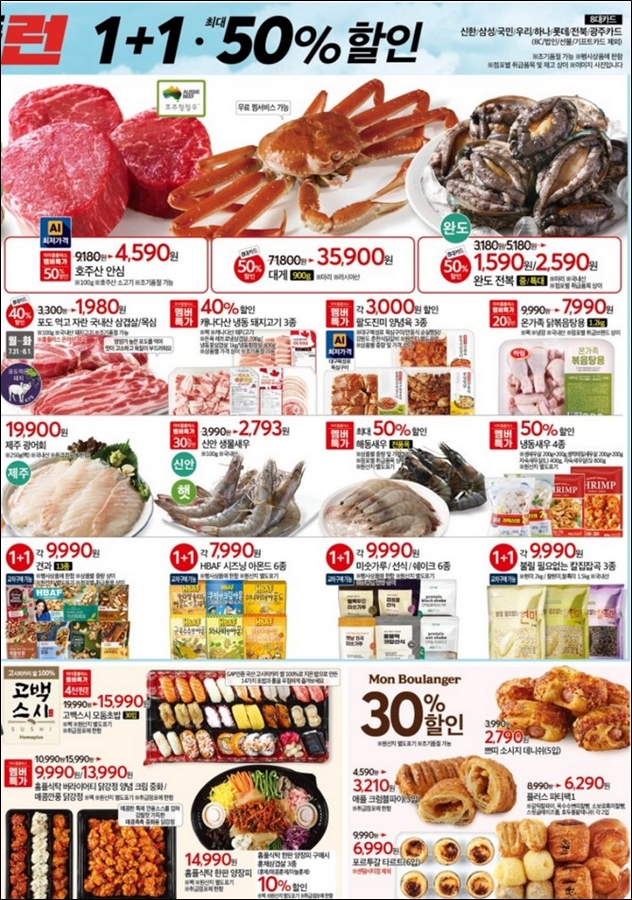 - 날짜별로 할인품목이 다르니 전단행사를 체크하는것이 좋고 특히 고기류는 날짜가 지정되어 있으니 참고 / 8대 카드 결제에 따라 할인 받을수있는 품목도 있으니 카드도 준비하세요.