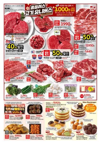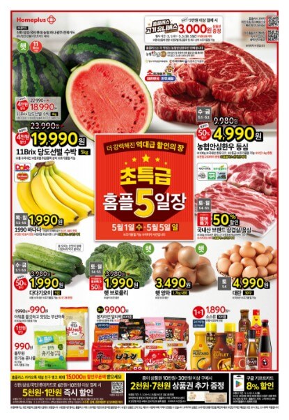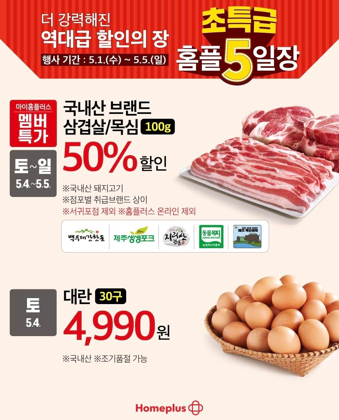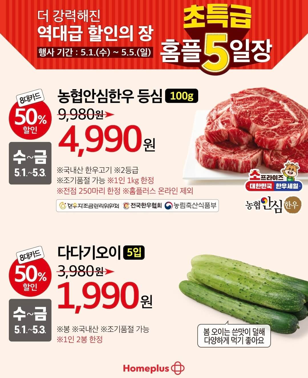 홈플러스 종이전단을 올려드리기에 앞서서 초특금 5일장에서 할인하는 대표적인 상품들을 먼저 정리해 볼게요. 홈플러스 5월행사에는 농협안심한우 등심, 국내산 브랜드 삼겹살과 목심, 다다기오이를 50% 할인하고 대란 30구를 4,990원에 판매해요. 단, 상품에 따라서 행사가 진행되는 날짜가 다르니 날짜를 꼭 확인하세요.