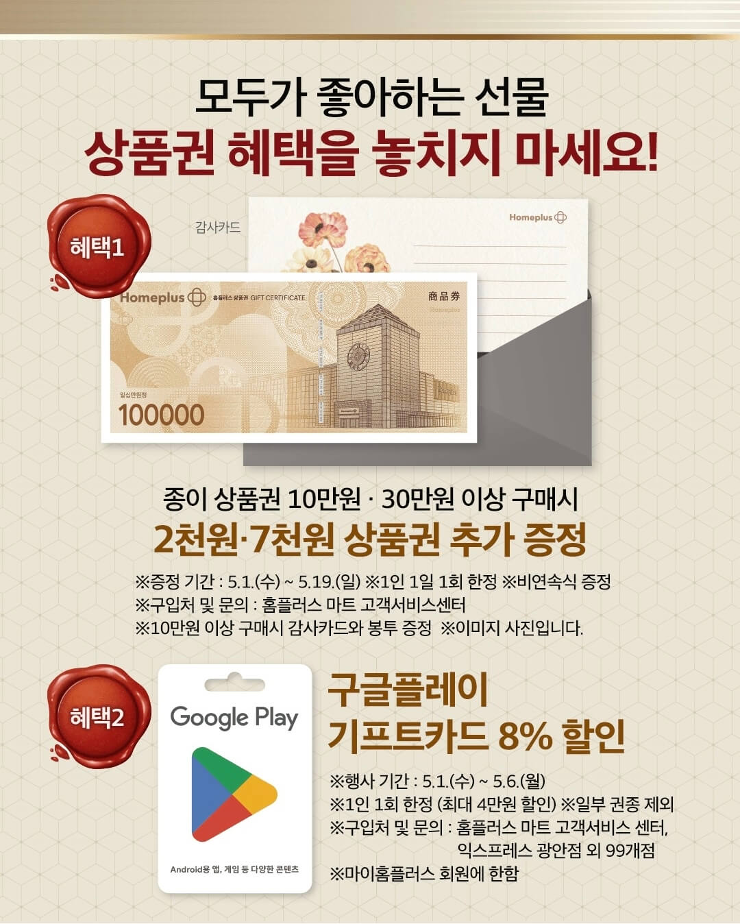 홈플러스 5월행사 인터넷쇼핑몰 전단 상품들에 대해 정리해 봤는데요~ 상품권 선물을 위해 상품권을 구매하는 분들께는 2천 원, 7천 원 상품권을 추가 증정하고, 평소에 구글플레이 기프트카드를 자주 구매하셨던 분들은 8% 할인된 가격으로 구매할 수 있다고 하니까 이번 행사를 쏠쏠하게 즐겨보세요.