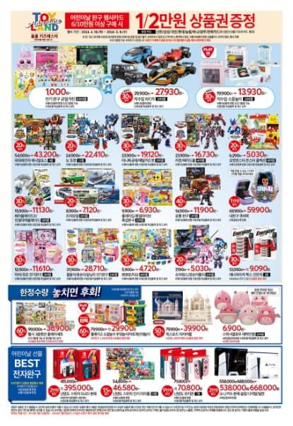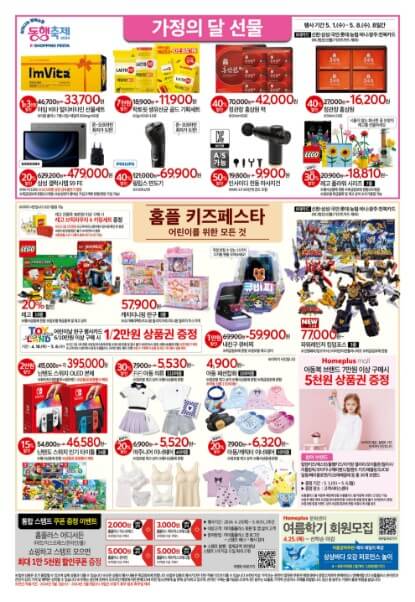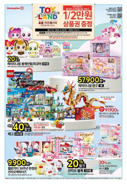 다양한 생활용품 및 식품은 당연하게 할인이 들어가고 어린이날을 맞이하여 어린이들에게 가장 인기가 많은 캐치티니핑과 산리오 제품들도 대폭 할인하고, 행사카드로 결제 시 구매한 금액에 따라서 1~2만 원 상품권도 증정한다고 하니까 저렴한 가격으로 선물도 사고 상품권도 챙기세요.