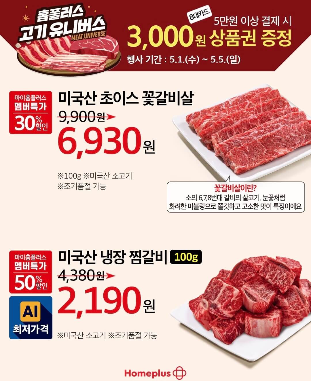 홈플러스 5월행사 품목으로는 고기가 빠질 수 없는데요~ 농협안심한우와 호주청정우 안심 그리고 미국산 초이스 꽃갈빗살과 미국산 냉장 찜갈비도 30 ~ 50% 할인된 가격으로 구매할 수 있어요.