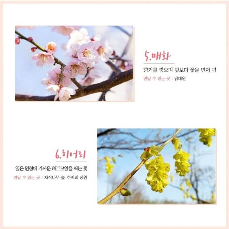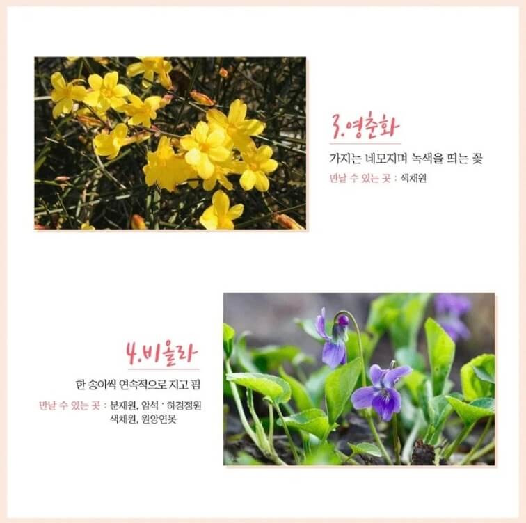 봄의 화담숲은 벚꽃외에도 풍년화, 복수초, 영춘화, 비올라, 매화, 히어리, 생강나무, 길마가지나무도 볼 수 있고 여름 끝자락에 피는 수선화까지 구경할 수 있는 곳이기도 해요.