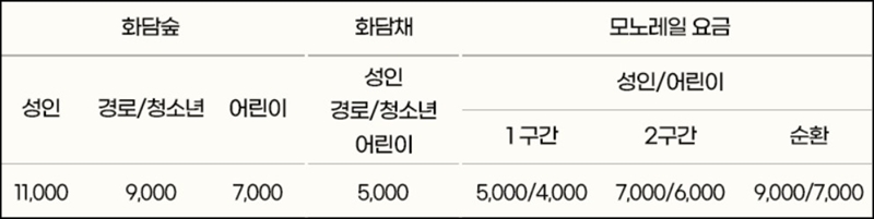화담숲은 화담숲에 입장할수있는 입장료와 모노레일 탑승권의 비용이 별개예요. 즉, 화담숲 입장료가 있는 입장권과 모노레일을 별도로 예매해야 한다는 것이죠~ 먼저 화담숲 입장료는 성인 11,000원 / 경로 및 청소년 9,000원 / 어린이 7,000원이에요.