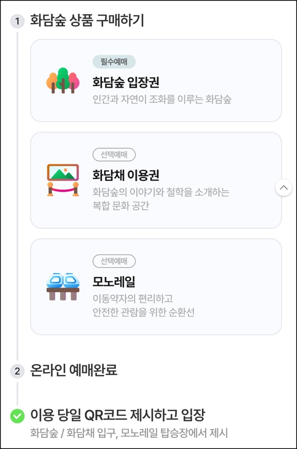 그럼 이제 화담숲 예약하기 방법에 대해 정리해볼게요. 화담숲 예약방법은 예약이 오픈되는 12일(수)에 홈페이지에 접속하여 화담숲 상품을 구매해야 해요. 필수로 예매해야 하는 입장권을 먼저 예약하고, 이후에 화담채와 화담숲 모노레일을 선택하여 예매하면 되는데요~ 화담채와 모노레일은 앞서 말했듯이 선택사항이기 때문에 입장권만 예약 후 방문해서 천천히 둘러보는 것도 좋아요.